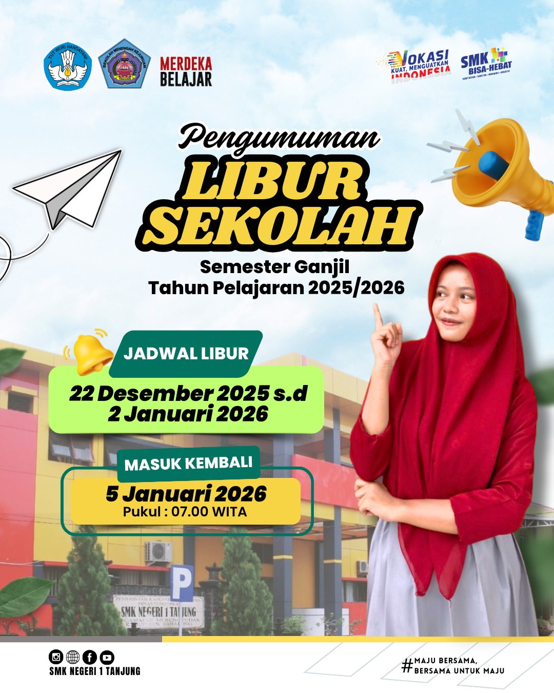 PENGUMUMAN LIBUR SEMESTER GANJIL TAHUN 2025/2026 19 Desember 2025 1 bulan yang lalu PENGUMUMAN LIBUR SEMESTER GANJIL TAHUN 2025/2026
