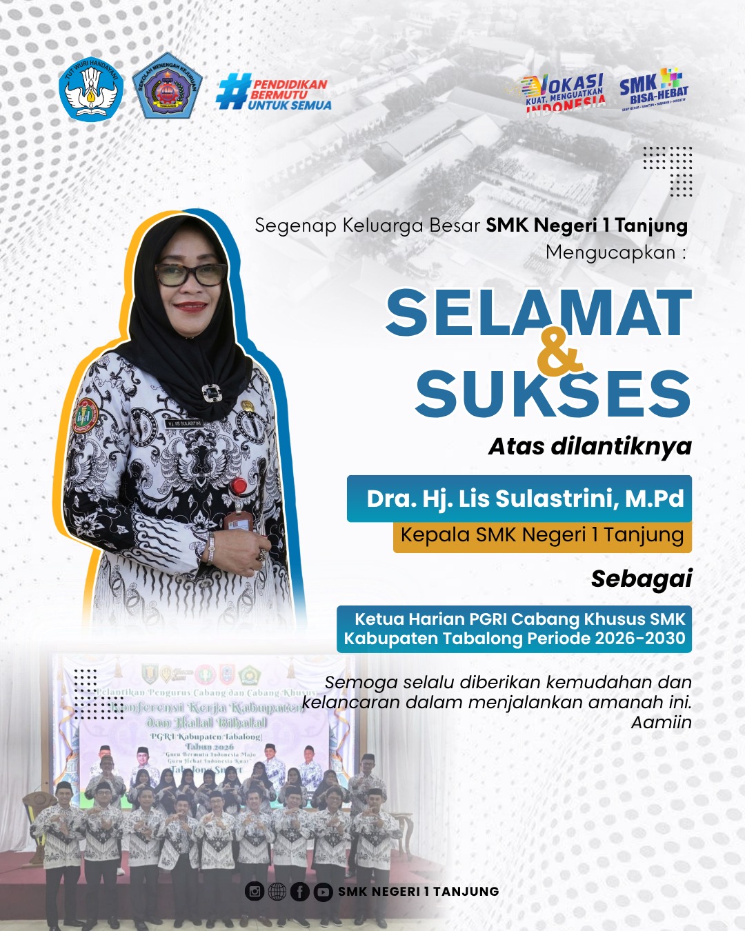 Semoga amanah dalam menjalankan tugas, membawa kemajuan bagi dunia pendidikan, serta semakin memperkuat peran PGRI dalam meningkatkan kualitas guru dan pendidikan, khususnya di lingkungan SMK Kabupaten Tabalong.