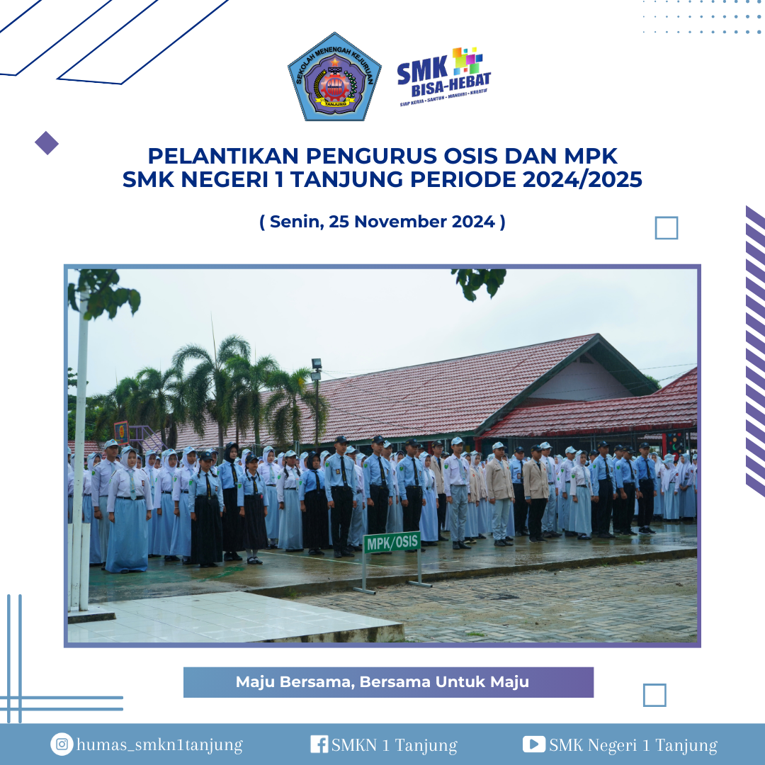Selamat bertugas dan berproses kepada Pengurus OSIS periode 2024, semoga pesan dan amanah yang telah kalian emban dapat dilaksanakan dengan baik. Mari tanamkan rasa cinta pada sekolah dengan berkegiatan yang positif sehingga SMK Negeri 1 Tanjung tercinta semakin maju dan selalu dipercaya dalam mencerdaskan anak bangsa.