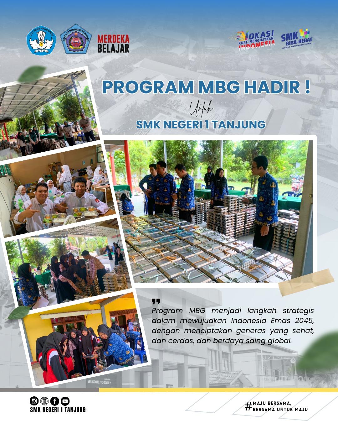 Pada Senin, 15 September 2025, SMK Negeri 1 Tanjung memulai Program Makan Bergizi Gratis (MBG). Program ini merupakan sebuah langkah konkret dari sekolah bersama pemerintah untuk menyediakan paket makanan bergizi secara gratis kepada seluruh siswa, dengan tujuan utama mendukung kesehatan dan pertumbuhan optimal para pelajar.